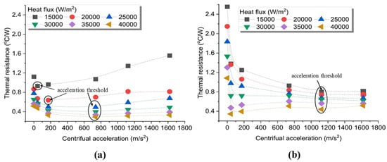 Aboutalebi et al. [] studied the influence of radial speed on the heat transfer performance of rotating closed-loop pulsating heat pipes (RCLPHPs) in radial mode, as shown in Figure 12. The results indicated that there is a gradual decrease in the thermal resistance of the PHPs as the rotational speed increases because more fluid can return to the evaporator after being condensed, and this not only reduces the possibility of dry-out phenomena but also speeds up the heat transfer rate. In particular, the heat transfer performance of the PHPs is improved significantly at high input powers. Dehshali et al. [] investigated the heat transfer performance of rotating closed-loop pulsating heat pipes (RCLPHPs) under different radial speeds. The results showed a lower thermal resistance in motion mode compared to stationary mode. Moreover, they indicated that with the increase in radial speed, the liquid could return to the evaporator section faster, and the vapor slug could be pushed to the condenser section faster. So, there is an increase in the thermal resistance as the speed increases. In particular, there is a decrease in the possibility of drying out at the top and bottom positions of the pulsating heat pipe. On-ai et al. [] evaluated the heat transfer performance of rotating closed-loop pulsating heat pipes (RCLPHPs) by measuring the working fluid temperature amplitude and frequency under different radial accelerations and heat inputs to determine the operating status. The results indicated that with the increase in acceleration, the temperature amplitude decreased and the flow pattern changed from an annular flow to a slug flow, and the flow direction of the working fluid inside the heat pipes transformed from oscillatory flow to stable cyclic flow. When the heat input increases, the temperature amplitude increases, the flow pattern changes from a slug flow to an annular flow with intermittent liquid slug, and the flow direction is always a circulatory flow corresponding to the magnitude of the centrifugal acceleration, thereby enhancing the overall performance of the heat pipes. In addition, the RCLPHP showed a slug-train flow pattern, the same as the ordinary CLPHP, during high centrifugal acceleration. Qian et al. [] investigated the heat transfer performance of rotating closed-loop pulsating heat pipes (RCLPHPs) containing acetone and deionized water under high radial centrifugal acceleration, as shown in Figure 13. The tests revealed that there is an acceleration threshold with the increase in radial centrifugal acceleration. And the acceleration threshold increases with the increase in heat flux. Below this threshold, the thermal resistance exhibits an inverse relationship with the acceleration; above the threshold, the thermal resistance will remain either constant or inversely proportional to the acceleration. The vapor and liquid phases can be separated to some extent by centrifugal force, and the increase in heat flow can slow down this phenomenon. So, there is a higher acceleration threshold under large heat flux. Acetone with lower surface tension has a lower acceleration threshold, as shown in Figure 14. Moreover, the acceleration threshold for DI water with higher surface tension is significantly larger. Finally, by considering the key parameters including the heat flux, centrifugal accelerations, thermophysical properties of the working fluid, dimensions, and working temperatures, a semi-empirical correlation of dimensionless numbers was built to estimate the heat transport. And the difference between the correlation values and the experimental results was less than 10%.