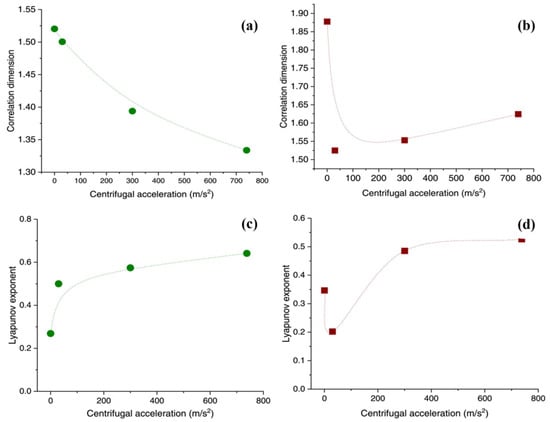In status with motion, the combination of centrifugal force and gravity affects the performance of PHPs simultaneously. The major phenomena during motion are summarized in Table 5. In space, pulsating heat pipes need to operate effectively in microgravity conditions. Parabolic flight experiments are adopted to conduct experiments with microgravity [,,]. Mameli et al. [] observed a sudden temperature increase in the evaporator section of pulsating heat pipes during microgravity, but intriguingly, this effect was reversible during the subsequent hypergravity phase. Maksym et al. [] observed a similar temperature increase in PHPs filled with ethanol under microgravity conditions. This phenomenon was attributed to the transition of the liquid plug’s movement from slug flow to annular or semi-annular flow, known as re-activation phases, triggered by pressure fluctuations or other influences. Interestingly, this transition ultimately restored the heat pipe’s heat transfer capabilities, as shown in Figure 9. Lastly, Mauro et al. [] investigated the stable operating condition of large-diameter PHPs under microgravity conditions. Their findings revealed that PHPs can maintain stable operation at a thermal input of 185 W. Cecere et al. [] investigated flat-plate PHPs utilizing water and a self-replenishing wetting mixture (water/n-butanol) as working fluids under variable gravity conditions. They observed that water is unable to operate in low-gravity environments, whereas PHPs filled with the self-replenishing wetting fluid can still operate normally during the microgravity phase, as shown in Figure 10. In addition, Sun et al. [] discovered that the heat transfer performance of PHPs is less dependent on the diameter and length of the pipe under microgravity, but the temperature has a greater impact than the diameter and length of the pipe.