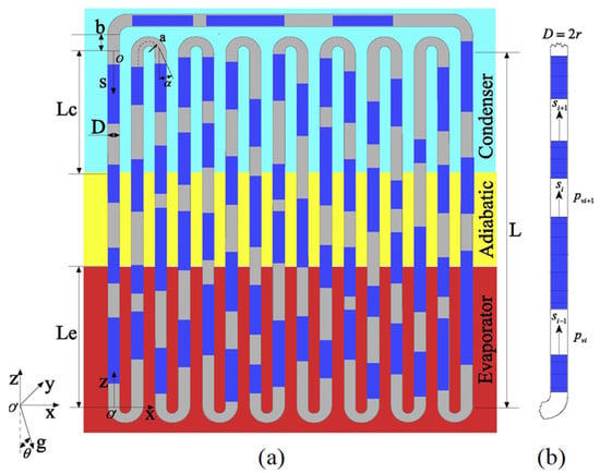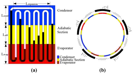 Pulsating heat pipes (PHPs), also referred to as oscillating heat pipes (OHPs) in certain references, represent an innovative heat transfer technology introduced by Akachi from Japan in the 1990s. A pulsating heat pipe consists of three main sections: an evaporator/heating section, a condenser/cooling section, and an adiabatic section [,,,], as shown in Figure 1. These pipes show a pulsating or oscillating movement of the working fluid within their channels, marking a significant advancement over traditional heat pipes and offering enhanced heat transfer capabilities in specific applications. Additionally, PHPs offer advantages such as high flexibility, rapid thermal response, and excellent heat transfer performance. Therefore, compared to traditional heat pipes, PHPs have a simpler and more compact structure, and are particularly suitable for applications where space is limited or there are cooling load challenges. Pulsating heat pipes find applications in various fields, including rotating machinery cooling [], battery thermal management systems [], the cooling of electronics [], and aerospace []. It is noteworthy that pulsating heat pipes exhibit considerable heat transfer efficiency even under microgravity and hypergravity conditions [].