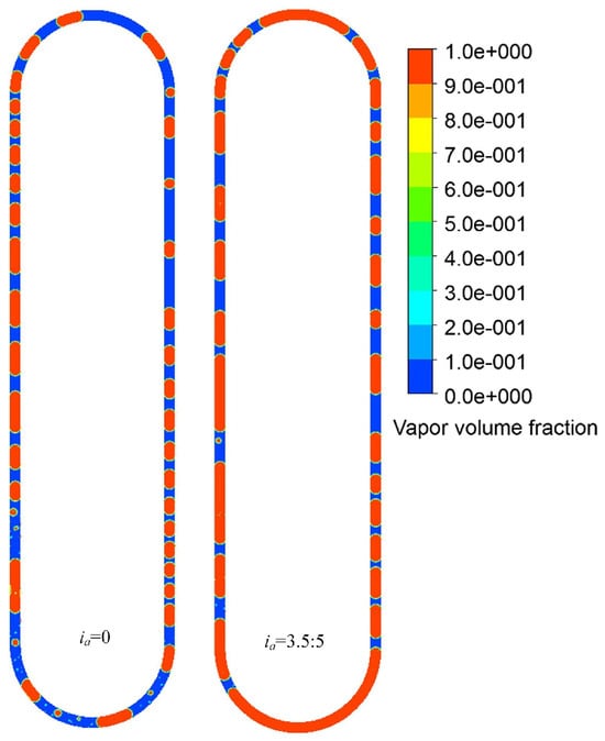 The relative length of each section in PHPs affects the heat transfer performance. It is certain that PHPs perform better when the amount of heat flux supplied in the evaporator is fully dissipated in the condenser region []. Reducing the condenser’s length diminishes the effective area for heat exchange. Therefore, we always want the condenser length to be greater than the evaporator length.