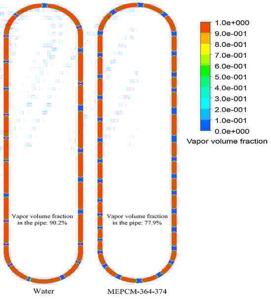 Table 3 shows the characteristics of fluids mixed with different working fluids. The addition of mixed media will increase the fluid’s dynamic viscosity, which raises flow resistance, leading to a decrease in the heat transfer performance of pulsating heat pipes. As a matter of fact, the mechanism behind the enhancement of PHPs by mixed working fluids is not clear. This may be attributed to the PCIE [], the synergistic thermophysical properties, and the transport characteristics induced by temperature and concentration gradients []. Therefore, there is a need to select the appropriate working fluid based on varying operating conditions.