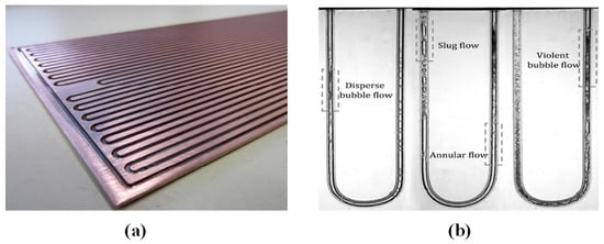 - Kim, Y.B.; Kim, H.; Sung, J. Investigation of Thermal Enhancement Factor in Micro Pulsating Heat Exchanger Using LIF Visualization Technique. Int. J. Heat Mass Transf. 2020, 159, 120121. [Google Scholar] [CrossRef]