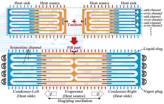 - Chen, X.; Chen, S.; Zhang, Z.; Sun, D.; Liu, X. Heat Transfer Investigation of a Flat-Plate Oscillating Heat Pipe with Tandem Dual Channels under Nonuniform Heating. Int. J. Heat Mass Transf. 2021, 180, 121830. [Google Scholar] [CrossRef]