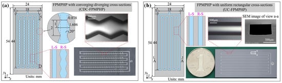- Chen, X.; Li, H.; Han, X.; Liu, X. Thermo-Hydrodynamic Characteristics of a Novel Flat-Plate Micro Pulsating Heat Pipe with Asymmetric Converging-Diverging Channels. Int. Commun. Heat Mass Transf. 2024, 152, 107282. [Google Scholar] [CrossRef]