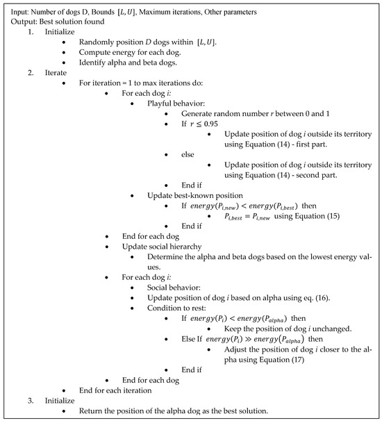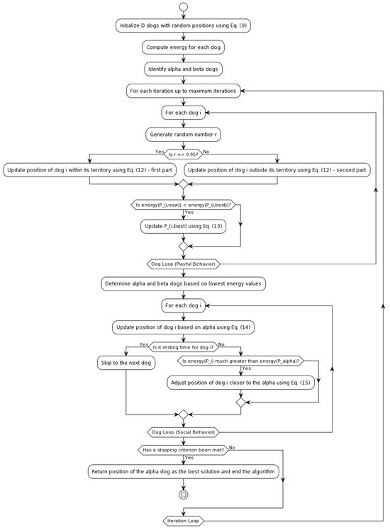 At pre-defined intervals or iterations, a subset of the dogs rest, ensuring that their positions remain unchanged for that iteration. However, if a dog’s current energy is significantly higher than the alpha dog’s energy, it might adjust its position closer to the alpha dog according to (6):