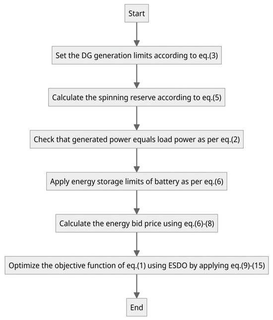 The suggested CMOS employs the ESDO to determine the ideal power outputs from various DERs within the microgrid. In this optimization approach, the power generated by the DERs is likened to the positions of the dogs, and their associated energy symbolizes the energy cost’s objective function. Figure 5 illustrates a flowchart of the proposed CMOS algorithm.