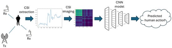 The general workflow of the method proposed by Jiao and Zhang []. First, CSI signals are converted into images, which are then analyzed by a CNN to predict human actions, using Gramian angular fields.