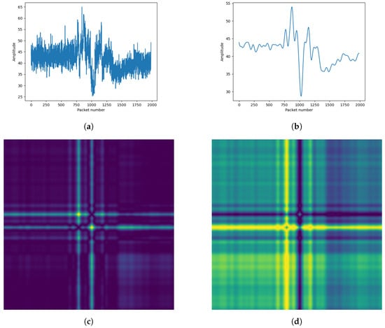 Illustration of CSI signal conversion to RGB image applied in the method of Jiao and Zhang []. (a) Raw CSI signal. (b) Filtered CSI signal. (c) GASF. (d) GADF.