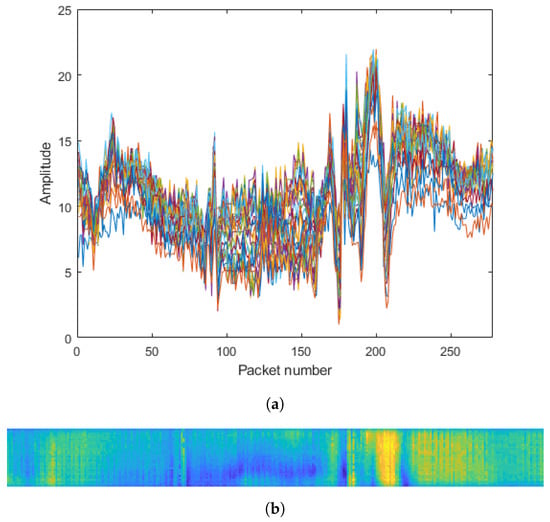 Illustration of CSI signal conversion to RGB image applied in Jawad et al.’s [] method: (a) 30 Hampel filtered CSI signals. (b) CSI signals converted to RGB image using MATLAB’s imagesc function.