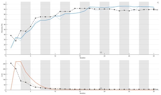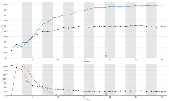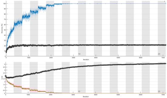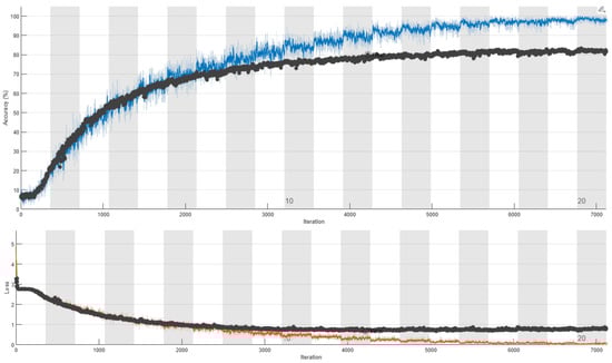 Training of ResNet50 on WiAR [] with respect to humans. In the upper figure, the training accuracy is represented by the blue line, whereas the validation accuracy is depicted in black. In the lower figure, the training loss is indicated in red, and the validation loss is shown in black.