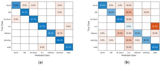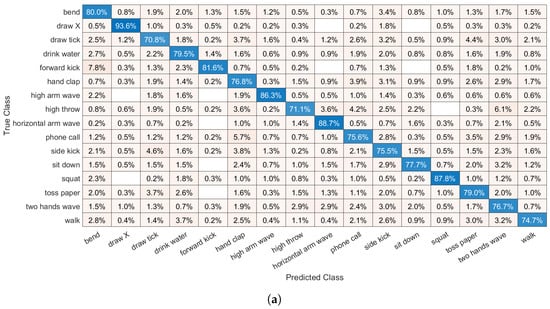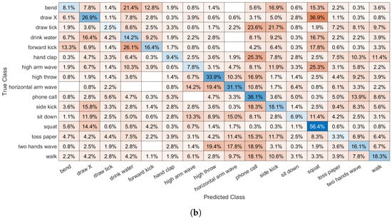 Confusion matrices of fine-tuned ResNet50 obtained on WiAR [] test set. (a) Results obtained from retraining without respect to humans. (b) Results obtained from retraining with respect to humans.