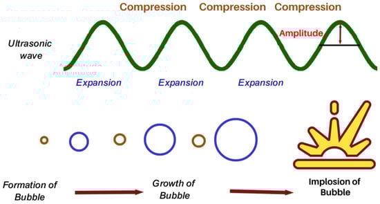 The process of ultrasonic pretreatment involves several key steps, including the compression and rarefaction of the medium; cavitation bubble formation; bubble collapse, generating shock waves; and the creation of microscopic channels in the medium (Figure 1). These steps are essential in breaking down the complex structures of organic pollutants and sludge, making them more amenable to further treatment processes []. Ultrasonic pretreatment has been recognized as an emerging and effective mechanical method to enhance the biodegradability of sludge, offering a green technology approach through the principle of cavitation induced by ultrasonic radiation. This technique has shown promising results in enhancing the efficiency of anaerobic digestion processes and improving the overall treatment of various organic materials.