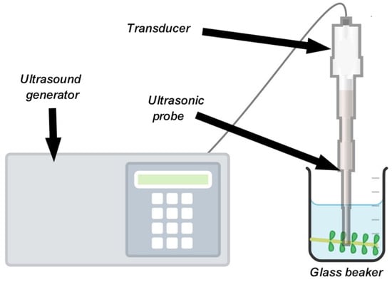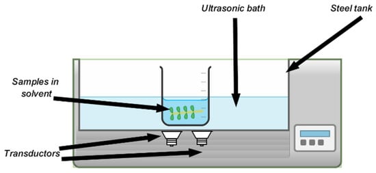 To use an ultrasonic bath for biomass valorization, the sample (biomass material) is typically placed in a suitable container or vessel that can be immersed in the liquid inside the ultrasonic bath (Figure 2). The container holding the sample should be positioned in such a way that it is fully submerged in the liquid to ensure the efficient transmission of ultrasonic energy to the biomass material []. The ultrasonic bath is then activated, and the high-frequency sound waves induce cavitation in the liquid, enhancing the breakdown of the biomass and promoting chemical reactions for valorization purposes. A transducer in an ultrasonic bath works by converting electrical energy into mechanical energy, which generates ultrasonic waves in the liquid medium. The transducer is typically attached to the bottom or sides of the bath, and it vibrates at a high frequency, causing the liquid to vibrate as well. This vibration creates cavitation bubbles in the liquid, which implode and generate high temperatures and pressure, leading to the breakdown of the biomass and the promotion of chemical reactions for valorization purposes [].