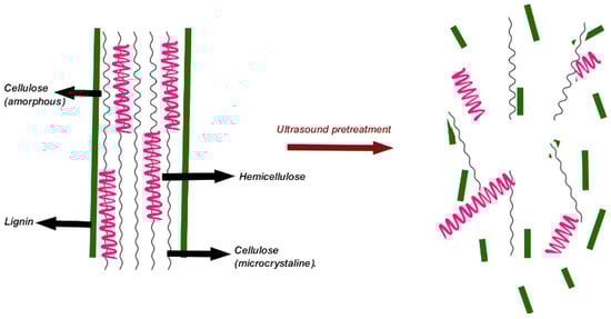 Cellulose and hemicellulose are carbohydrate polymers that can be converted into sugars through hydrolysis. Ultrasound can help with the hydrolysis of cellulose and hemicellulose by increasing the surface area of the biomass, which makes it easier for the enzymes to access the cellulose and hemicellulose []. Ultrasound can also help with the solubilization of the hemicellulose fraction as xylose, which can be further processed into bio-based chemicals and materials [].