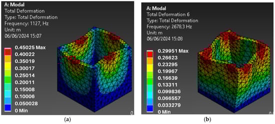 In this section, a modal analysis is performed to determine the frequency behavior of the parts with respect to the applied loads. The most important parts for ultrasonic pretreatment are the tank and rigid structure, because these are the critical parts for the operation of the equipment when the generator is started and vibration occurs. Using the ANSYS program, the tank was meshed for analysis, and fixed support was defined at the bottom of the tank. This process was simulated in different modes, where the deformation of the tank at the different frequencies supported by the part was evidenced. Likewise, it was evidenced that the largest deformations occurred in the central parts and the corners of the upper part. Figure 8 shows the modal analysis, where a deformation sequence is displayed at a minimum frequency of 1127 Hz with 0.45025 m of deformation up to 2678.3 Hz with 0.29951 m of deformation.