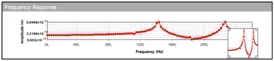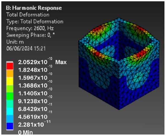 To solve the harmonic response of this part of the design, in addition to the fixed support, a weight force that the tank could withstand according to its volume was established. This was followed by a harmonic response (Figure 9), showing the total deformation of the tank, where the maximum deformation occurred in the upper center with a value of 2.05 × 10−10 m. The frequency response graph is shown in Figure 10.