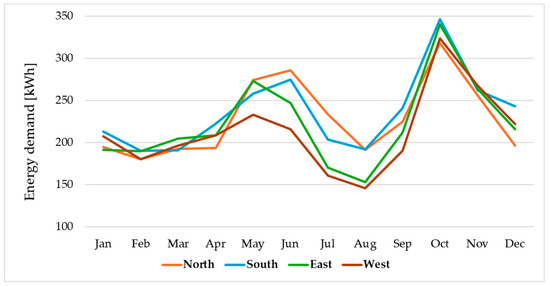 The highest energy demand (heating + cooling) occurs in the autumn period (Figure 4). This is consistent with the location under study. On the other hand, it is essential to highlight that peak demand does not have to be shown in the month when HVAC consumption is highest [57]. Based on the results, the western orientation is to be selected for this construction configuration, in terms of energy demand for air conditioning, resulting in a 10% reduction in demand over the less favourable southern orientation. This may be justified because the western orientation has a high potential to effectively balance heating and cooling energy demands across seasons. This orientation takes advantage of the sun’s position in the late afternoon, which is particularly beneficial in climates with temperature variations between day and night. Taking into account the data obtained for the heating of the building, we observe that the lowest value energy demand occurs when we place the construction in a western orientation. This orientation reduces the annual energy consumption used for heating by 9% compared to the least favourable orientation, the southern orientation. We also verified that in monthly terms, the highest demands occur in the winter cold months, reaching 200 kWh. It is important to note that the main façade has small windows, while the rear façade has large windows. It was determined that the main façade of the house was where the access door was located. The consumption results based on orientation for the location studied are justified in terms of this construction configuration. As can be seen from the results, containers allow the implementation of innovative and efficient isolation systems. By covering the containers internally and externally with high-quality insulating materials, energy losses are minimized in winter months, and gains are reduced in summer months, optimizing energy use for air conditioning. The recorded energy consumption estimation is equivalent to or even lower than a house of similar dimensions that is traditionally built.