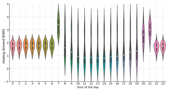 Hourly heating demand was analyzed throughout the year. The statistical distribution of the hourly heating demands data for a January day using a violin plot is shown in Figure 5. A box plot and a symmetric kernel density plot are combined to create the violin plot. This allows for comparing many distributions by providing precise data on the distribution’s spread, outliers, asymmetry, and central values [78]. The shape in Figure 6 represents the data density determined using the kernel approach. More data are connected to a given value when the shape is wider. The width of the violins indicates the variability in heating demand, with wider violins suggesting more significant variability. The thin line represents the lower and upper percentiles, while the thick line segment displays the 25th to 75th percentile. The median of the distribution, represented by a white equis, takes higher values for the early morning hours (around 6 a.m.) and the evening (around 6 p.m.), likely related to the occupants’ daily activities, such as waking up and returning home, i.e., the heating demand shows significant variability throughout the day, with distinct peaks during certain hours, suggesting a daily pattern in heating usage. Demand appears lower during midday and afternoon, possibly indicating more moderate outdoor temperatures or that the facility is unoccupied during these hours. Some hours show a more concentrated distribution (thinner violins), indicating more consistent demand. Near-zero values at certain hours suggest periods of very low or no heating demand. These patterns can help design more efficient heating systems, scheduling heating to turn on before demand peaks and off during low-demand periods. Overall, Figure 5 suggests a clear daily pattern in heating demand, with peaks in the early morning and evening. This understanding can be valuable for energy management and optimizing heating usage to improve energy efficiency. The behavioural pattern remains consistent across all months.