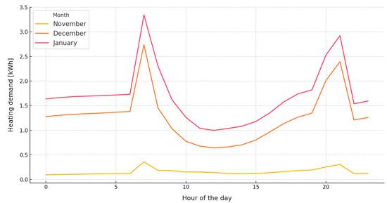 Hourly heating demand patterns for the months of November, December, and January.