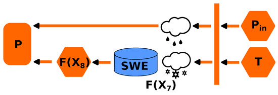 The Génie Rural (GR) models are conceptual rainfall and runoff models that treat the catchment as a single entity, referred to as lumped. Various versions have been developed over the years, from the well-known GR4J model [21] to the GR6J model [22], with the aim of improving the modeling of small flows. A snow accounting model called CemaNeige [3] can be combined with the daily and hourly GR models or used independently of them. The algorithm in CemaNeige, which is presented in Figure 1, can be described as follows: precipitation (P) consists of rain and melted snow, which accumulates in a reservoir SWE according to function F(X7), and is converted into liquid precipitation using the snow-melting function F(X8).