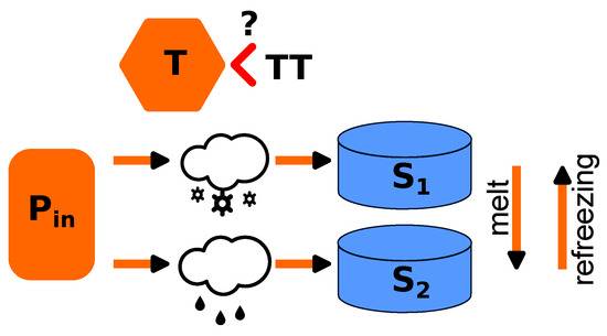 The HBV model has undergone improvements, with a commonly used version being HBV-96 [24]. This conceptual hydrologic runoff model simulates discharge using precipitation, temperature, and potential evaporation estimates. It consists of routines for snowfall, groundwater, evaporation, and runoff routing, utilizing a triangular-shaped weighting function. A schematic representation of the snow model relationships is shown in Figure 2. The model algorithm separates incoming precipitation ( P i n ) into liquid and solid based on ambient temperature, with solid precipitation falling into the snow storage reservoir ( S 1 ), and rain entering the liquid water reservoir ( S 2 ). An exchange of liquid occurs between these reservoirs through the melting of snow and the freezing of water.