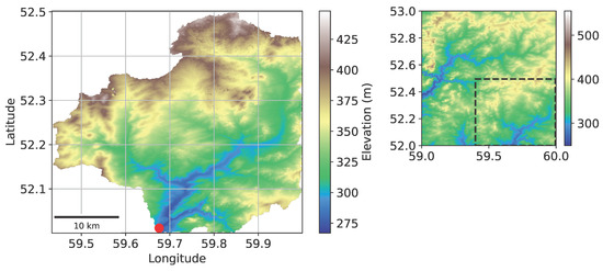 Figure 3. Representation of catchment under study: the left side is the elevation distribution on the catchment view, with the outlet of catchment as a red dot; the right side is an extended view of the study area.