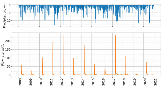 The accuracy of forecasts is significantly affected by the length of meteorological observation data and recorded flow data. A 12-year dataset from 1 January 2008 to 1 January 2020 for the considered catchment contains both meteorological parameters and river flow rate data, as presented in Figure 4. Forecast models are expected to underestimate runoff values in such case, a finding consistent with previous studies. In the work [32], the authors divided a 64-year observation period into subsets of different lengths (2, 5, 10, 20, and 30 years) to examine their impact on annual runoff forecasting. The results showed similar error ranges for both 2- and 5-year calibration data for each percentile, with significant reduction in overestimation when at least 10 years of calibration data were available. However, underestimation remained high even with 20 years of recorded flow rate data.