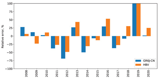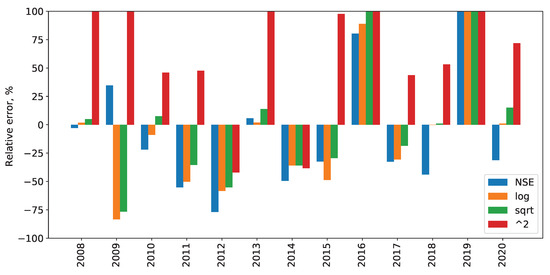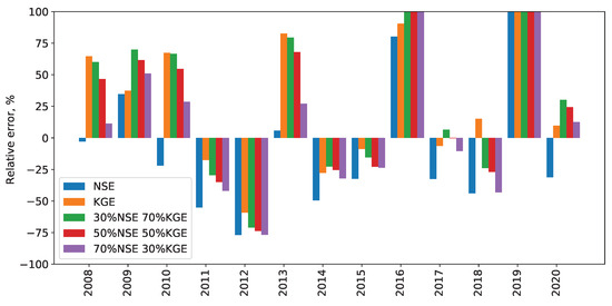 The results presented below illustrate the influence of the chosen objective function on the calibration process of the GR6J-CemaNeige model. The evaluation of all modeling strategies is primarily based on the most critical project parameter: the volume of runoff during the spring flood period, as defined by dependencies (3)–(5). The objective function employs metrics such as NSE (1) and KGE (2) as foundational elements. Figure 8 presents a comparison of relative errors in total runoff during the flood. In addition to single-metric objective functions, this study also explored multi-metric approaches that incorporate multiple performance metrics with adjustable weighting coefficients. Specifically, three different objective function configurations were considered, each weighing the contribution of two metrics differently: (1) NSE at 70% and KGE at 30%, (2) NSE at 50% and KGE at 50%, and (3) NSE at 30% and KGE at 70%.