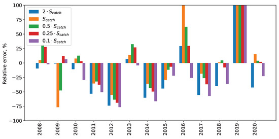 Figure 10. The value of the modeling relative error when using different coefficients of effective catchment area (GR6J-CemaNeige).