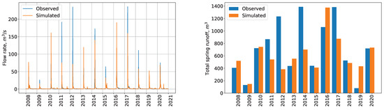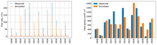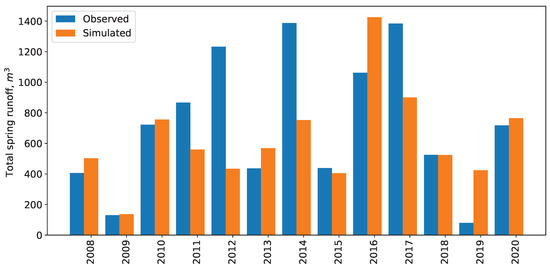 where Q o b s and Q s i m are the observed and simulated total runoff during the spring runoff period, calculated as t = 1 N Q t .