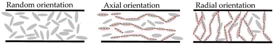 Techniques for aligning filler particles in a polymer matrix have been explored. The alignment of the filler particles can be achieved by flow-assisted alignment and by field-assisted alignment (e.g., electrical, magnetic or acoustic field) [62,63,64]. Controlling the particle orientation leads to changes in functionality and filler content efficiency and influences the mechanical, thermal and electrical characteristics of the composite material.
