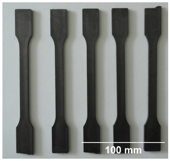 Injection-molded PP-GR specimens with 50 vol.% graphite used for tensile and three-point flexural tests.
