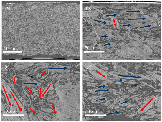 Figure 5a shows SEM images of the cross-section of the tube wall of a PP-GR tube with a wall thickness of 1.5 mm and a high graphite content of 50 vol.%. The SEM images display the agglomerated grey graphite flakes and the black PP matrix. The image in Figure 5b shows the outer edge of the cross-section, and the image in Figure 5d shows the inner edge of the cross-section. The images indicate that the agglomerated graphite flakes have a more horizontal direction (marked with blue arrows). In contrast, Figure 5c shows that the graphite flakes in the middle zone of the cross-section of the tube wall have a more radial (through-wall) direction (marked with red arrows). The particles near the tube wall are aligned horizontally because of higher shear forces close to the tube wall during tube extrusion. Particles in the middle zone face less shear forces during extrusion and thus are more aligned in the radial direction. Increasing the portion of radially aligned graphite particles could lead to a higher thermal conductivity of the composite in radial (through-wall) direction.