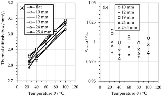 Measuring the anisotropic thermal conductivity of thin-walled and curved composite samples is a challenging task. The thermal diffusivity was measured with the laser flash method, as described in Section 2.3.2. The effect of the curvature of the sample on the measurement was determined by comparing the measured thermal diffusivity of a flat titanium alloy grade 5 sample with the measured thermal diffusivities of various curved titanium alloy grade 5 samples at different temperatures, as presented in Figure 6a. Figure 6b shows the ratio of the thermal diffusivity of the curved sample and the flat sample at different temperatures. The difference between the measured thermal diffusivities of the curved and the flat samples relative to that of the flat sample is less than or equal to ±2%. Thus, a measurement error of ±2% is assumed for the curved polymer composite samples.