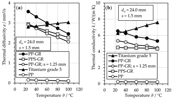 The measured thermal diffusivities of PP-GR, PPS-GR, unfilled PP and titanium alloy grade 5 are presented in Figure 7a. The thermal conductivities, calculated according to Equation (2), are shown in Figure 7b.