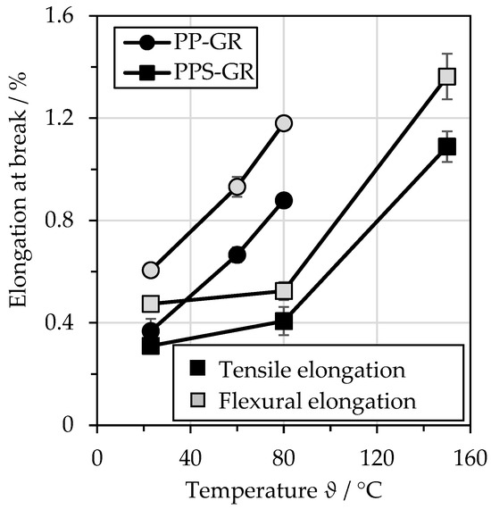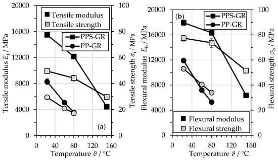 Flexural tests were performed with a 1 mm/min test speed, as stated in DIN EN ISO 178 [78], and at the same temperatures as the tensile tests. For PP-GR and PPS-GR, three flexural tests were performed at each temperature.