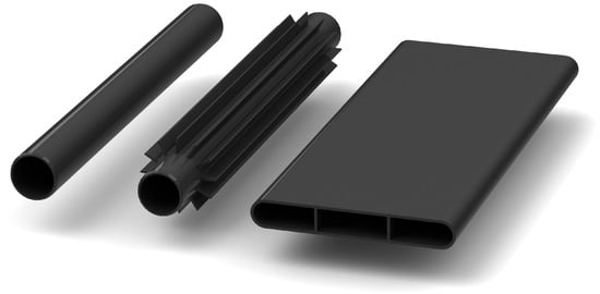 Most developments have been focused on thermally enhanced polymer composite parts produced by injection-molding for the thermal management of electronic devices, batteries and photovoltaic cells [17,37,42,43,58,59]. However, manufacturing of polymer composite tubes with enhanced thermal conductivity by extrusion has been scarcely investigated. Öztürk [60] found that the maximum filler content in a PA 6-graphite compound for extrusion and injection-molding was about 35 vol.%, indicating the challenges of extruding polymer tubes with high filler loadings. A high filler loading increases the viscosity of the molten composite, which poses challenges for conventional polymer processing techniques. With standard extrusion processes, filler contents of up to 15 to 20 vol.% are common [13]. Sobolčiak et al. [61] prepared composites composed of high-density polyethylene (HDPE) and expanded graphite. The blends were hot-pressed. The researchers found that 50 wt.% of graphite increased the thermal conductivity of HDPE to 2.18 W/(m K). Furthermore, they assumed that filler loadings below 30 wt.% could be processed by the conventional extrusion process, while filler loadings above 30 wt.% required injection-molding due to the complex viscosity profiles involved [61].