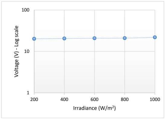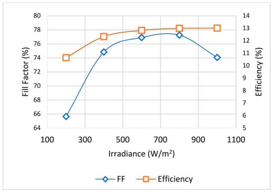 | Irradiance (W/m2) | Isc (A) | Voc (V) | Pmp (W) | FF |