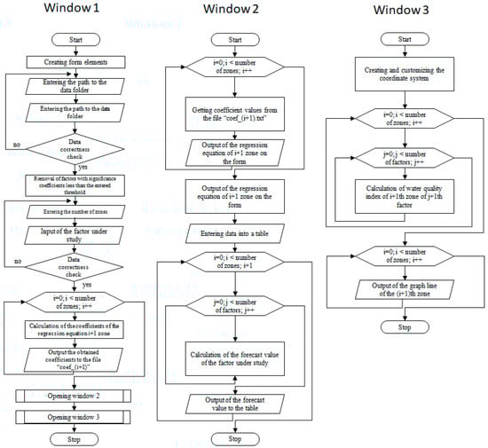 Block diagram of the algorithm of the software of the information and analytical system, where «Window 1» is the algorithm for entering information, «Window 2» is the derivation of the regression equation and the construction of a forecast; «Window 3»—Calculating the Water Quality Index (compiled by the authors).