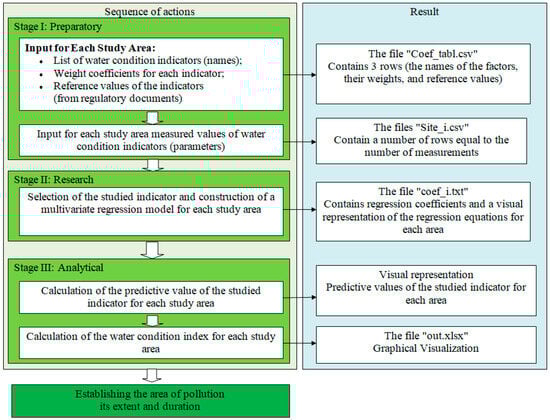 This article demonstrates the functionality of the described approach, whose scientific novelty lies in the content of the algorithm for performing operations through multifactorial correlation regression analysis of primary water quality indicators, zoning of aquatic areas, and subsequent calculation and evaluation of the water quality index. The accuracy and reliability of the proposed method are determined by the number of zones and corresponding sensors, their distribution across zones, instrumental factors, and the volume of information obtained and statistically processed.