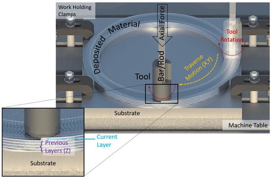 The AFSD process, which is currently almost always performed on a CNC cartesian coordinate machine, uses a substrate mechanically mounted on the machine table, as shown in Figure 1. The feedstock, which has a square or circular cross-section, is fed through a rotating tool and pushed towards substrate’s top surface vertically via an actuator. As the result of this initial motion, the generated frictional heat causes a localised increase in temperature around the tool. Since the temperature increases, the yield strength of the feedstock material decreases, and material becomes softer and more ductile. With the yield strength reduced, the feedstock material undergoes significant plastic deformation. It then yields and is forced outwards, filling the space between the substrate and rotating tool. As the material is forced outwards, the combined compressive force from the feed mechanism and shearing force from the rotating tool cause the material to plasticise. This rapid plastic deformation results in further volumetric heat generation []. The deposited material mixes with the substrate or previous layers as it is plastically deformed and forced into the substrate in the feedstock zone, creating a strong metallurgical bond. The substrate is also heated, softened, and forced upwards into the tool’s affected zone, resulting in a strong interface []. Once plasticisation is initiated, computer numerically controlled (CNC) in-plane motion is used to deposit material in the desired shape.