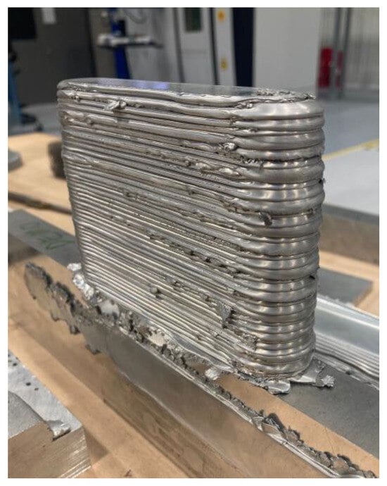 AFSD is a near-net shape process and the achieved in-plane resolution is very low compared to other AM processes such as PBF-LB, limited to approximately 10 mm or higher depending on the tool and feedstock geometry []. Components also have a poor surface quality and machining is almost always needed, as demonstrated by the wall geometry in Figure 3. The poor surface quality on the side walls is primarily caused by flash, which forms as excess material is forced out beyond the deposition zone of the tool. This causes weak bonds between layers at the edges of the deposited track, where the flash is not mixed with previously deposited material or substrate [].
