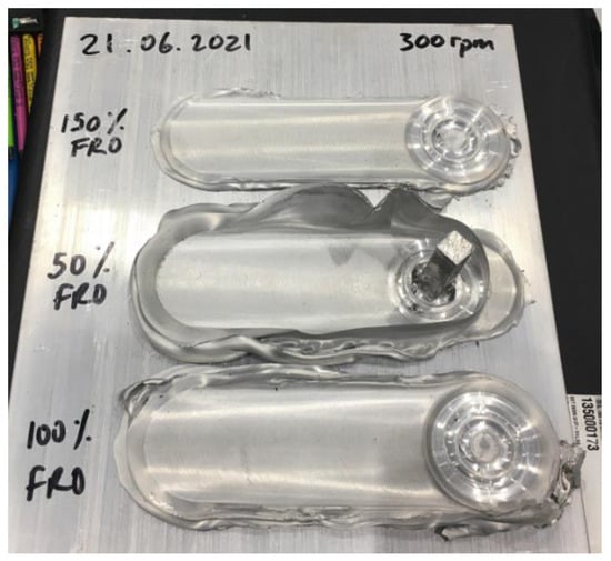Actuator speed (F), also known as actuator feed rate, is crucial for the interfacial bonding, porosity, and microstructure of the deposit []. The feedstock feed rate is controlled by a linear actuator that applies force at the top of the feedstock. This force is nonlinear because the feedstock’s elastic modulus and shear behaviour change with increasing temperature near the interaction zone. Thus, as the feedstock is heated and plasticized, the required force at the deposition zone for a given feed rate varies []. Williams et al. fabricated AA7020 components at different building rates by adjusting the traverse rate, deposition rate, and actuator feed rate. They used three different actuator feed rate values of 50.4, 101.6, and 254 mm/min, corresponding to slow, medium, and fast building speeds, respectively. It was clear that the slow build produced considerably more flash compared to the medium and fast builds. The slow build also resulted in the lowest deposition efficiency at 56.9%, whereas the medium and fast builds achieved deposition efficiencies of 73.3% and 81.3%, respectively []. Researchers at University of Sheffield, AMRC North West attained a comparable outcome when working with Al6061 aluminium alloy on the MELD L3 machine. By keeping all process parameters constant, but lowering the feed rate override (FRO) to 50% (using only half of the set actuator speed), there was an increase in flash formation and also a decrease in productivity (see Figure 5).