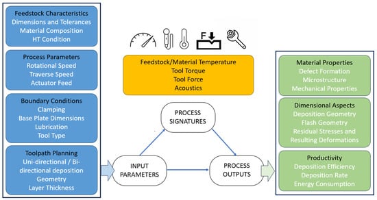 Effective in situ monitoring techniques, particularly temperature control and material flow analysis, are critical for optimising the process and improving the performance of the deposited product. In situ sensors such as thermal imaging cameras, pyrometers, and embedded thermocouples provide critical data on temperature evolution [,], while force sensors and torque transducers offer insights into the mechanical aspects of the process []. Additionally, advanced imaging techniques can be used to observe material flow and deformation, further contributing to the optimisation and control of the AFSD process [,]. Figure 6 shows the relations between the process inputs and outputs as well as the signatures of the AFSD process. While temperature evolution has received the most attention, there are other process signatures that can be used as control factors for ensuring high product quality, such as actuator force or torque.