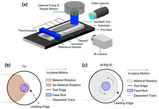 (a) An illustration of the in situ monitoring system consisting of infrared and video cameras. The material flow behaviours of (b) Cu and (c) AA6061 [].