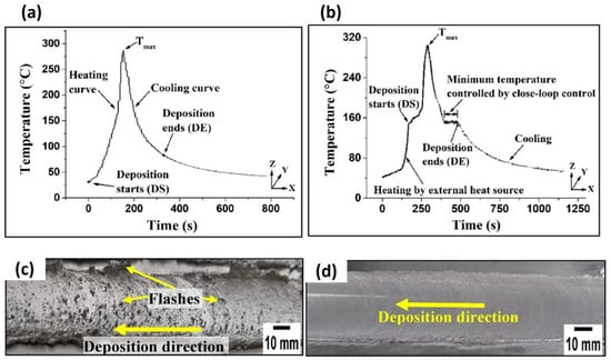 Chaudhary et al. also proposed a closed-loop control system designed to manage the temperature during the AFSD processing of AA6061 []. To reduce the thermal gradient along the build direction, an in situ temperature-controlled system was used to keep the deposition temperature minimum. In addition, the highest temperature during deposition was continually measured with a pyrometer and a thermal imaging camera []. Their findings revealed distinct thermal behaviours, as follows: without any external heat source, as shown in Figure 9a, the temperature initially increased due to the friction between the tool and substrate. It peaked and subsequently returned to the room temperature as the tool moved away from the measurement point. Conversely, in the presence of an external heat source, the temperature was kept at a minimum value until it gradually returned to the room temperature, as demonstrated in Figure 9b. This disparity in temperature profiles resulted in considerable variations in the quality of single-layer depositions, as seen in Figure 9c,d []. Lower deposition temperatures were clearly related with lower surface quality, as evidenced by the increased occurrence of flashes including accumulated particles in the deposition. In contrast, higher temperatures cause the production of continuous deposition layers with increased surface quality, as depicted in Figure 9d. This improvement is related to the increased material flowability observed at higher temperatures []. Moreover, it is shown here that the temperature regulation during deposition in AFSD technique is critical for the obtained part quality [].