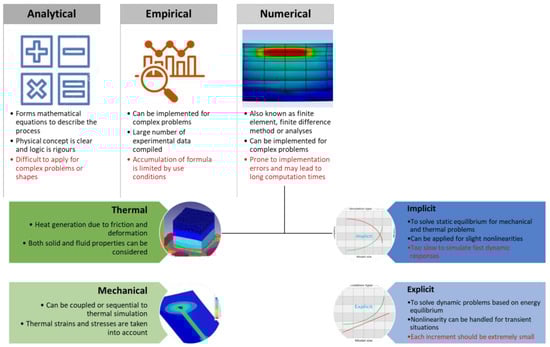 Since AFSD is a relatively new AM process, there are only a few modelling studies that exist in the current state of the art [,,]. Yet, tracing pioneering modelling efforts for the FSW process can provide valuable insights for modelling AFSD, given the similarities in the underlying process physics. For a systematic review of the current state of the art, the classification of different modelling techniques and scales may give useful information for choosing the right modelling approach, considering the complexity, applicability, and computational efficiency of simulations. Figure 10 shows the classification of modelling techniques. In Figure 10, black coloured texts show advantages and red coloured texts show disadvantages of each modelling technique.