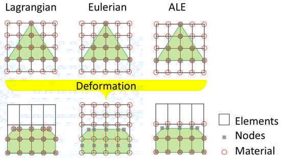The modelling efforts were expanded to include computational fluid dynamics (CFD) to model the problem domain with an Eulerian solver using the finite volume rather than the traditional finite element meshes []. Different solvers like Lagrangian, Eulerian, or Arbitrary Lagrangian Eulerian (ALE) can handle mesh deformation in various ways (see Figure 11). In Figure 11, red circles show material coordinates while grey squares for nodes and white squares illustrate initial position of the elements and green shadings show the deformed status of the material. The Lagrangian formulation allows for anisotropic material properties to be unaffected by the material’s current spatial orientation. This is particularly useful for structural mechanics and other areas of physics that involve a solid material experiencing gradual deformation, which may be anisotropic. If the emphasis is on recreating the physical condition at specific locations in space, an Eulerian expression is typically more practical. Especially with liquids and gases, it is often not feasible to monitor the condition of each individual particle. Conversely, an inherent issue with the pure Eulerian formulation is its inability to accommodate moving domain boundaries, due to physical limitations. That is why it is often preferred to use ALE solutions when it comes to modelling of friction-based processes. Further efforts by Guerdoux combined the accuracy of Lagrangian method with the efficiency of Eulerian method to simulate the whole FSW process []. The same solution methods were also practised using other commercial software suites [].