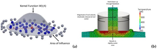 Even though FSW simulations achieved a certain level of computational efficiency and robustness, research on process modelling for the AFSD is still ongoing. The complexity of the process due to layer addition and generation of 3D shapes is an added challenge for this process. Mendieta et al. [] conducted a study using AFSD modelling on AA6061-T6, which is commonly used in aerospace applications. They attempted to validate their modelling research by comparing the remaining outcomes with experimental data obtained using the contour method. The obstacles in computation, such as simulation times, were addressed by using either an uncoupled or sequential method. While they simulated the initial friction stir process individually, they utilised the resulting strains from this to predict the remaining stresses in the sample []. Zhang et al. [] adopted a moving heat source model for temperature predictions and compared the outcomes with experimental results. They simplified the heat source in their research by introducing a heat fraction flow coefficient between the tool and substrate to represent surface heat input. They also used an AA6061-T6 alloy for manufacturing the specimens and measured the temperatures with the help of infrared radiation image. They reported peak temperatures starting from approximately 400 °C for the initial movement and going down to 300 °C for consecutive layers. Some other research groups introduced meshfree approaches using Smoothed Particle Hydrodynamics (SPH) as a computationally efficient method [,]. In the scope of meshfree SPH method, a smooth hyperbolic kernel function, as shown in Figure 12a, was introduced to include the material properties and their interactions with each other. In this manner, the Newtonian hydrodynamics governing the equations were solved in a Lagrangian manner (see Figure 12b) []. By this way, more accurate temperature predictions were claimed. The reported temperature values for AA6061-T6 varied between 300 and 525 °C [].