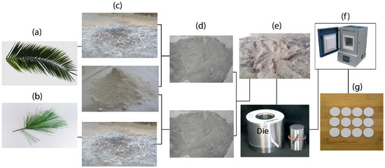 Ceramic specimen preparation schematic. (a) Date palm tree (DPT) leaf. (b) Pine tree (PT) needles leaf. (c) Extraction of different ashes for mixing. (d) Mixing of ashes. (e) Sludge preparation by moulding process. (f) Electric furnace for sintering process. (g) Final ceramics specimens.